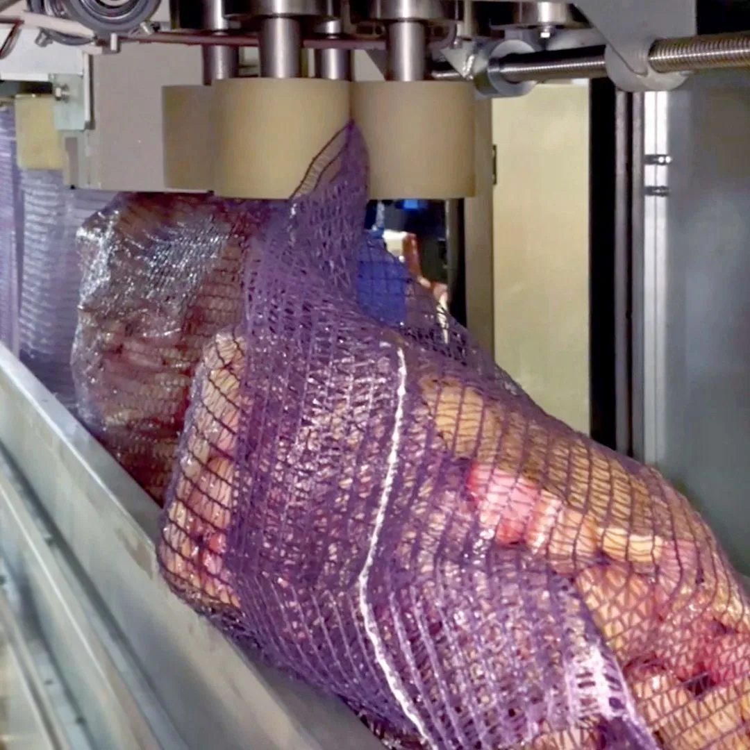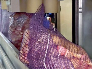 Упаковка грязных овощей в сетку мешок на рулоне